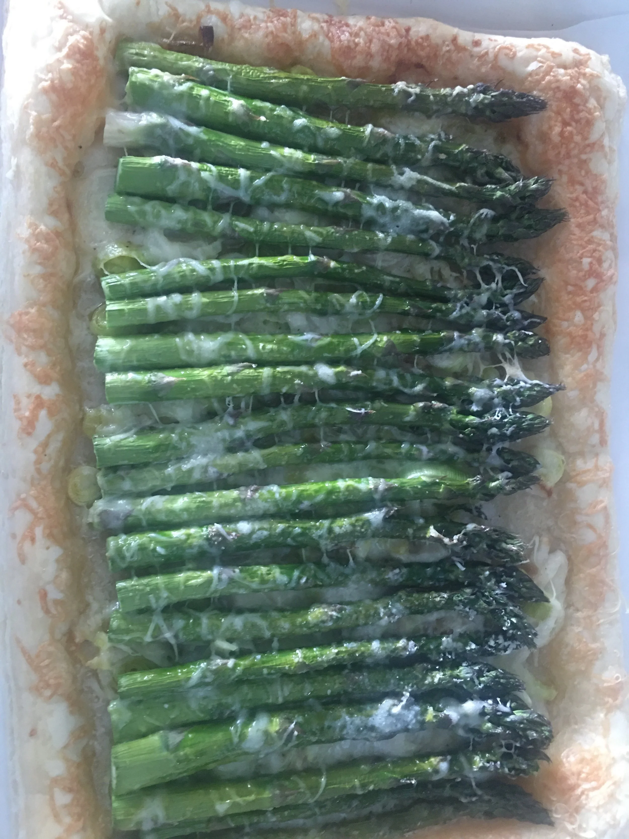 Sprinkle Gruyère cheese over asparagus and pastry border